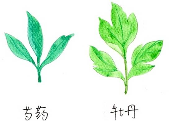 花朵可能还有些分不清它们的区别,但它们的叶子比较好区别,牡丹叶片较为宽阔肥大,叶片正面颜色青翠,背面有淡黄,且表面有白粉;而芍药叶片较尖西狭长,叶色浓绿偏黑。
